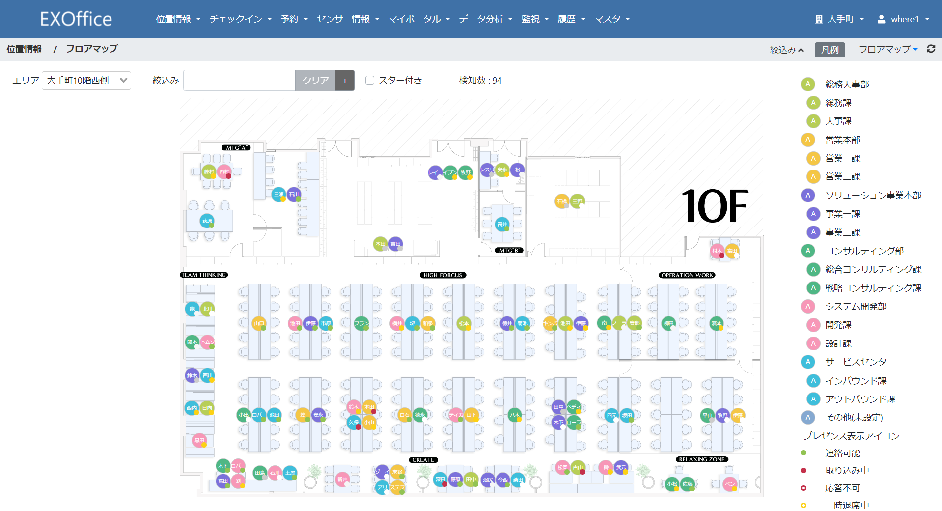 EXOfficeを使えば全ての従業員が互いの所在地をリアルタイムに把握し、必要なコミュニケーションを迅速に行うことができます。また、EXOfficeの交流分析機能を使えば「どの部門の誰と誰がどのくらい交流しているのか」といった情報もわかるので、組織全体のコミュニケーションを活性化するのにも役立ちます。