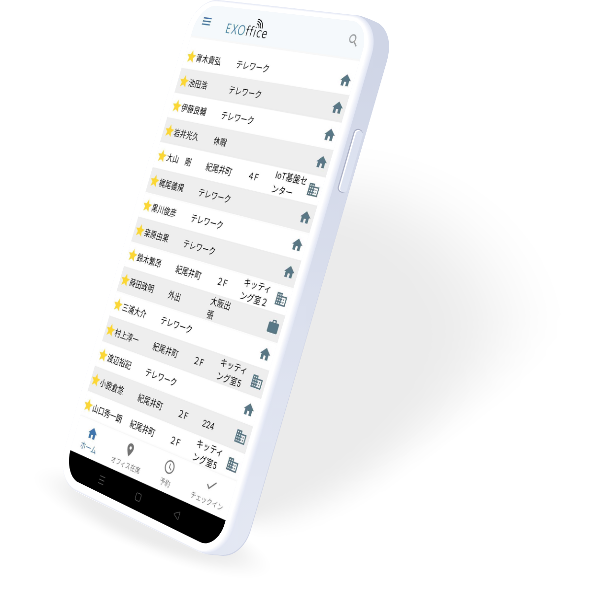 EXOffice Appは、EXOfficeサービスを利用する際、利用者に保持していただくスマートフォン用のアプリです。利用者の位置情報の測定や見える化、座席や会議室の予約やチェックイン、テレワークや外出時の始業終業のチェックなど、働き方をもっと自由に変えます。