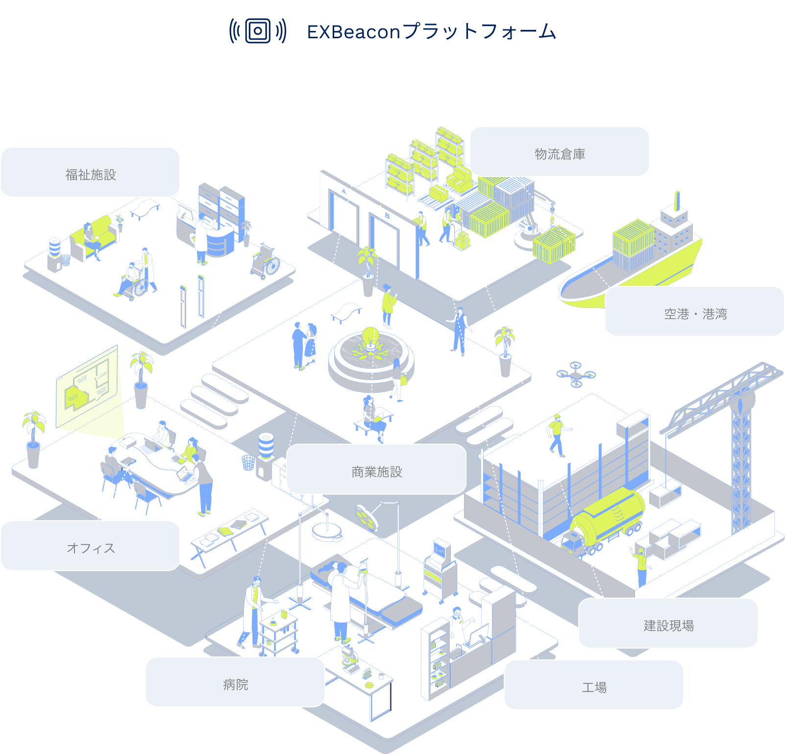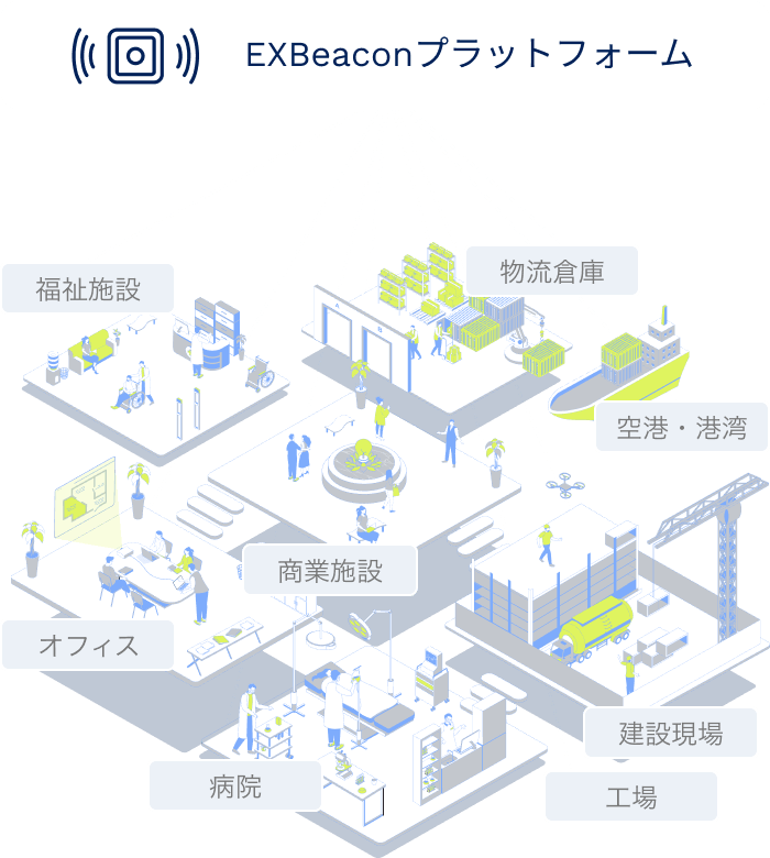 EXBeaconプラットフォームは、オフィスビルだけでなく、病院・工場・物流拠点・商業施設など、多様な建物に展開可能なIoT基盤です。